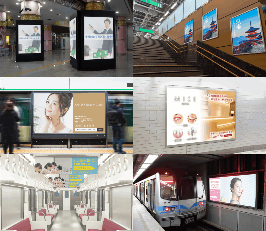 (例 駅看板広告・デジタルサイネージ・駅貼りポスター・フロア広告・大型ボード広告・ホームドアステッカー広告・柱巻き広告・フラッグ広告・自動改札ステッカー広告など)